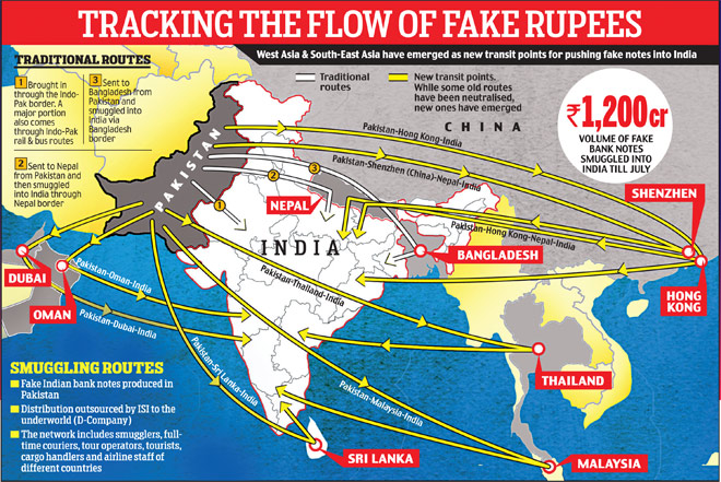 Indian intelligence agencies have already found that that most of the FICNs in circulation in India are reportedly printed in government-controlled printing presses at Karachi, Multan, Quetta, Lahore and Peshawar in Pakistan, and the Inter-Services Intelligence (ISI) has a major role in it.