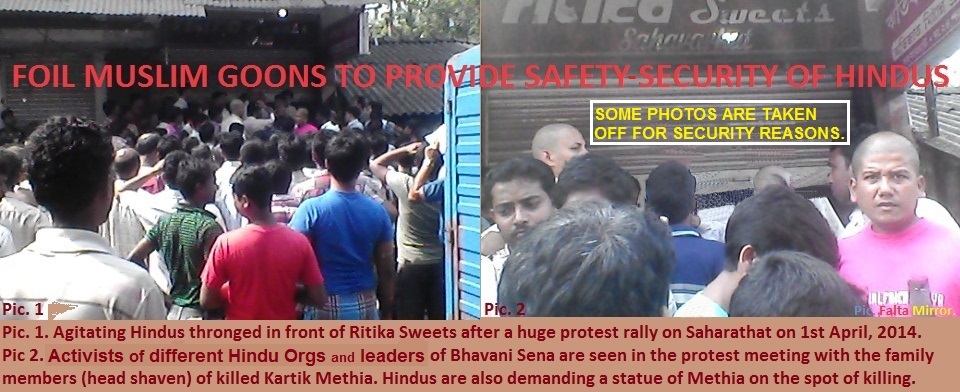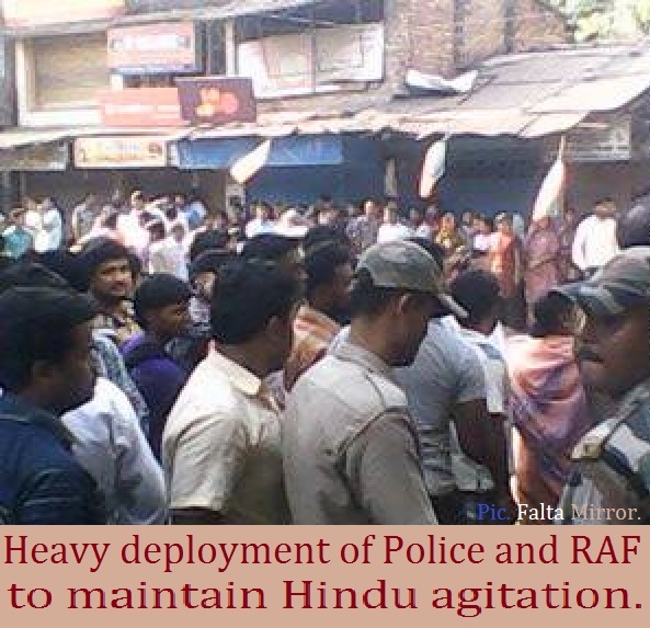 Falta SahararhatFollowing the unbelievable murder of Mr. Methia (Ghosh), the entire area was overwhelmed with anguish and anger against the inaction and failure of the local administration to nab the murderers yet.  A large number of protesting people blocked the Falta Main Road, as a mark of their demand to arrest and punish the perpetrators immediately. As a matter of fact two adjacent police stations viz Ramnagar PS and Falta PS  are failed to provide safety and security to the local Hindu residents as allegedly keep relations with Muslim gang leaders connected with various anti social activities including illegal cow trading, arms trading, women trafficking etc. all against Hindus’ interest. Actually, Hindus have lost all confidence on police officials, especially on Sakir Ali – DSP and two Inspectors-in-Charge of Falta and Rammagar PS. It has been learnt that these two police officers have alleged connections with the local criminals, especially with those from the Muslim majority village of Sonakopa. The Hindu protestors raised slogans against police administration for playing an anti Hindu role, only to favour with the Islamic hooliganism in the area.  Mrs. Moumita Saha, SDO-in-Charge of Diamond Harbour reached the spot  and assured all possible efforts for making immediate arrest and staunch action against the perpetrators.