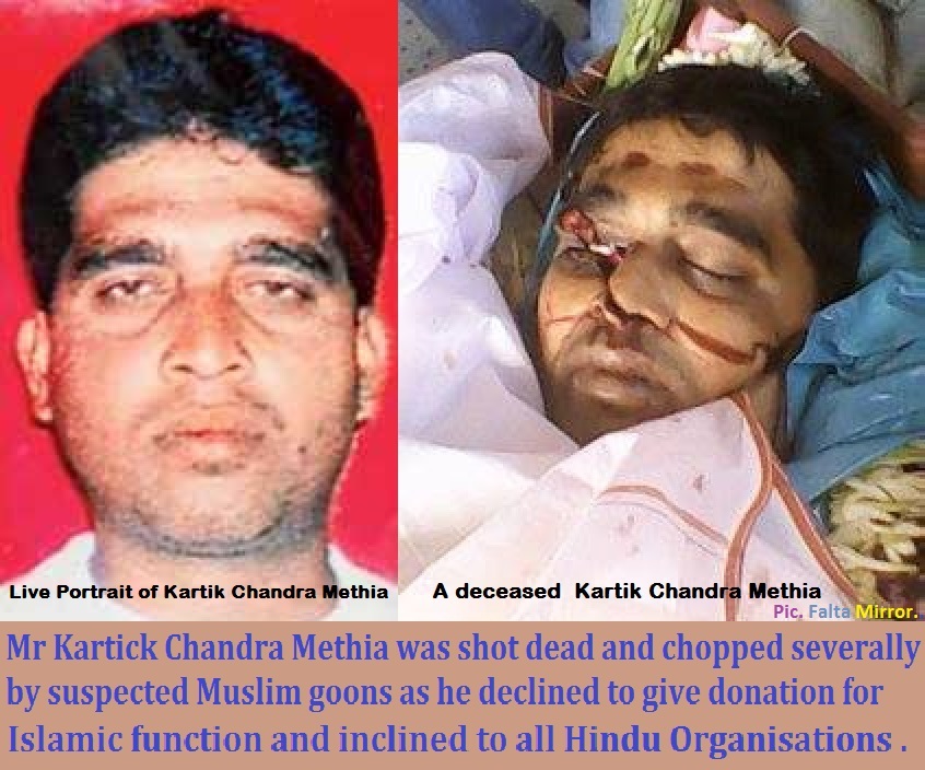 Kartik Chandra MetiaTapas  Bishwal | Hindu Existence Bureau | Sahararhat | South 24 Pgs | West Bengal | 30 March 2014:: Even a TMC supporter and Hindu businessman is being brutally murdered by the Islamic goons in West Bengal for his inclination to Hindu organisations and declining donations to Islamic hoards. Mr. Kartik Chandra Methia (Ghosh) aged abput 43 yrs, a successful Hindu businessman and a well acclaimed supporter of Local TMC (Trinamul Congress, the ruling party of West Bengal) was shot dead from point blank range and chopped with swords to ensure his death by suspected Islamic perpetrators in the late evening of March 29, 2014. The gory killing of Mr Methia (Ghosh) took place inside the confectionery ‘Rwitika Sweets’ located at Jagannathpur junction of Sahararhat Market on Falta road within the jurisdiction of Falta PS in the district of South 24 Paraganas in southern West Bengal. It was known that a team of six or seven miscreants riding motorbikes entered the confectionery shops in two groups one after another. They also ordered some sweets and curds (yogurts)  to consume. But, all on a sudden they attacked Mr Methia (Ghosh) with gun-shot and started chopping with swords repeatedly to be sanguine of the murder.  The suspected perpetrators came from a Muslim majority village named ‘Sonakopa Muslim Para’ in close proximity, as reported by the local witnesses.  The ghastly incident took place in front of  the workers of the confectionery and a few customers present in the nearby shops. They were too afraid and startled to raise any alarm even and to thwart any such approach, a few bombs were also hurled for the success of the well planned operation. Three sharpened weapons were also recovered from the spot.