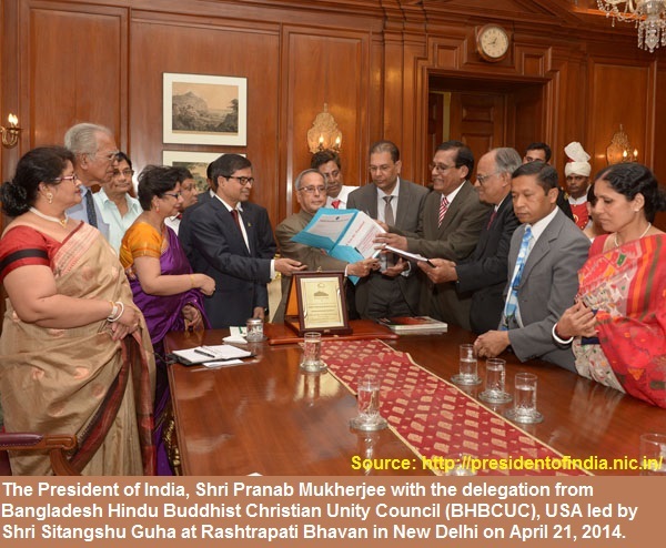 Hindu Existence Bureau | New Delhi | 22 April 2014:: The President of India, Shri Pranab Mukherjee met the delegation from Bangladesh Hindu Buddhist Christian Unity Council (BHBCUC), USA led by Shri Sitangshu Guha at Rashtrapati Bhavan in New Delhi on April 21, 2014.
