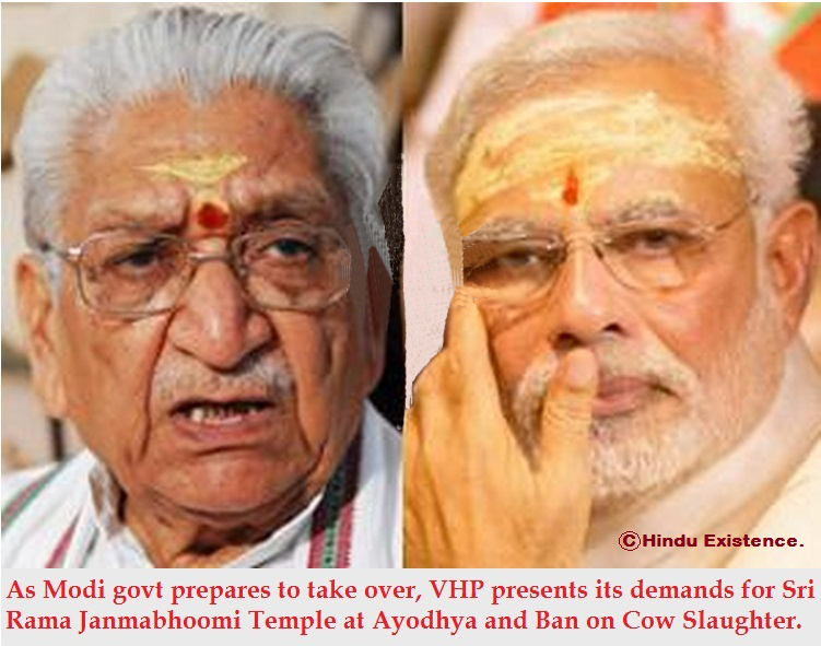 PTI | New Delhi | May 24, 2014:: As the Narendra Modi government prepares to take over, BJP’s affiliate outfit the Vishwa Hindu Parishad came out with a wishlist on Saturday ranging from Ram temple to law (read ‘ban’, Ed. HE.) on cow slaughter which it wants to be addressed within the constitutional framework.