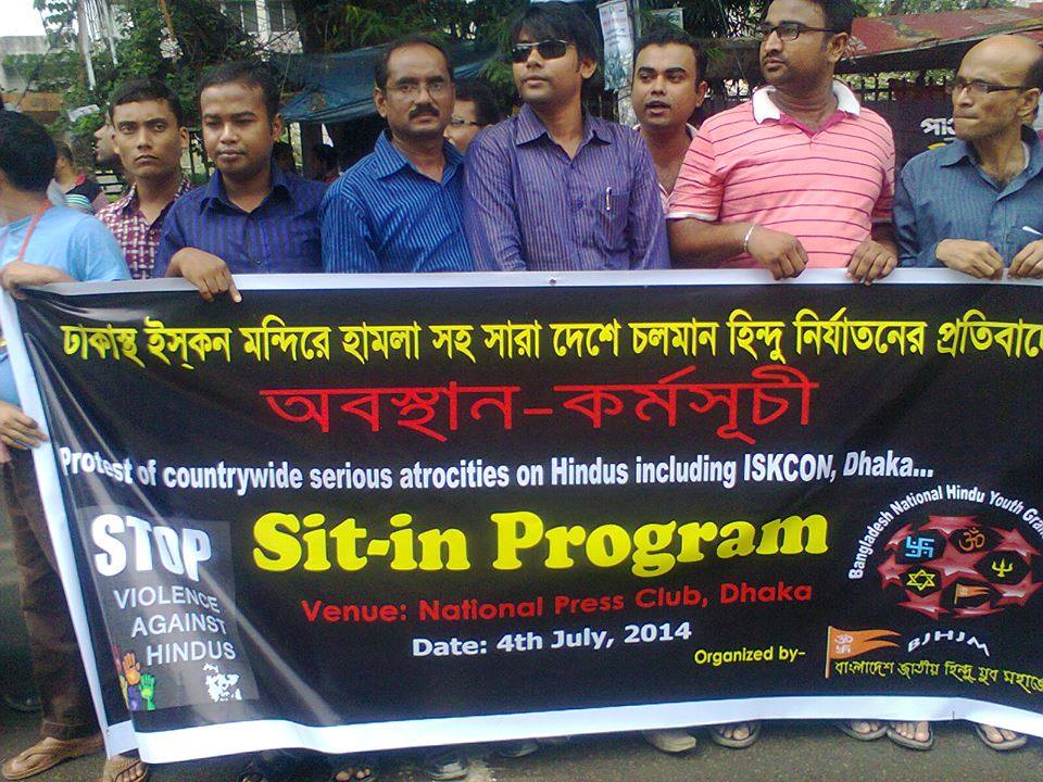 To protest this attack on ISKCON temple and Chariot festival of Lord Jagannath along with the continuing persecution of Hindus and other minorities in Bangladesh, a sit-in protest program was held outside the National Press Club in Dhaka today on July 4 2014) at 10am onwards. The program was organized by the Bangladesh Jatiya Hindu Mohajot and its alliance viz. Jago Hindu Parishad, Justice For Hindus forum etc.