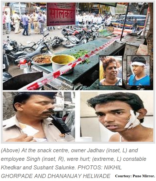 “Police constable G K Khedkar was parking his two-wheeler when the bomb went off near by, and sustained injuries on his chest because of shrapnel. He said, “I had just parked my bike when the blast occurred. For moments, I could not comprehend what happened” as reported in Pune Mirror.
