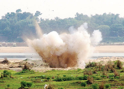 The home-made bombs being detonated on the banks of the Damodar on Friday by Bengal police before central agencies could examine them. Courtesy: The Telegraph.
