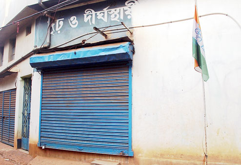 A shuttered room in the blast-hit building in Burdwan with a Trinamul flag nearby. Local Trinamul supporters said the party office’s board was removed soon after the explosion. But Trinamul leader Mukul Roy said the party never had an office there. Picture by Munshi Muklesur Rahman.
