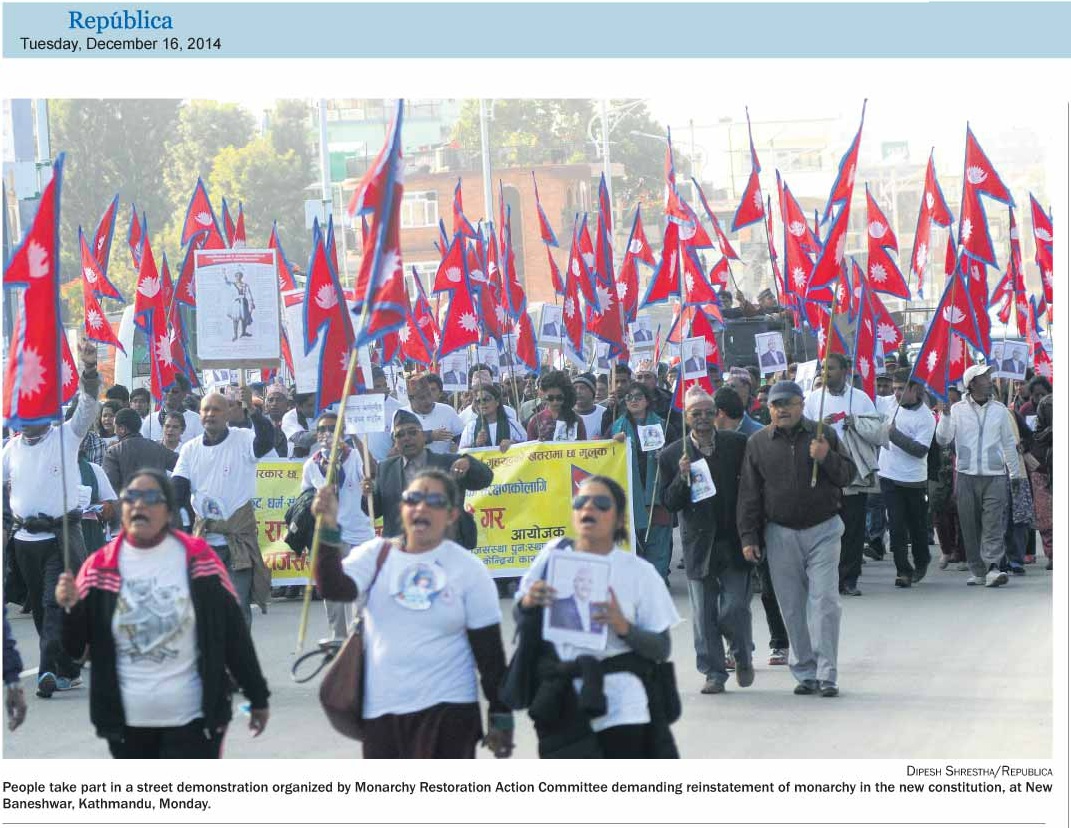 Bibek Raj Deb | HENB | Kathmandu | 16 Dec 2014:: In these days movements in Nepal for restoring Nepal as a Hindu Rashtra and Hindu monarchy are taking high momentum in all the districts as a spontaneous public repercussion against pendancy of Nepal Constitution and the political hegemony of ruling parties and Maoists in particular. Through a big conspiracy the monarchy and Hindu Rastra identity of Nepal were crushed down by the Maoist parties in 2008. since then the restoration of Hindu Rastra and the Monarchy in Nepal are the main contention of the Nepalese people disillusioned from the Christian conspiracy with the help of some foreign countries.