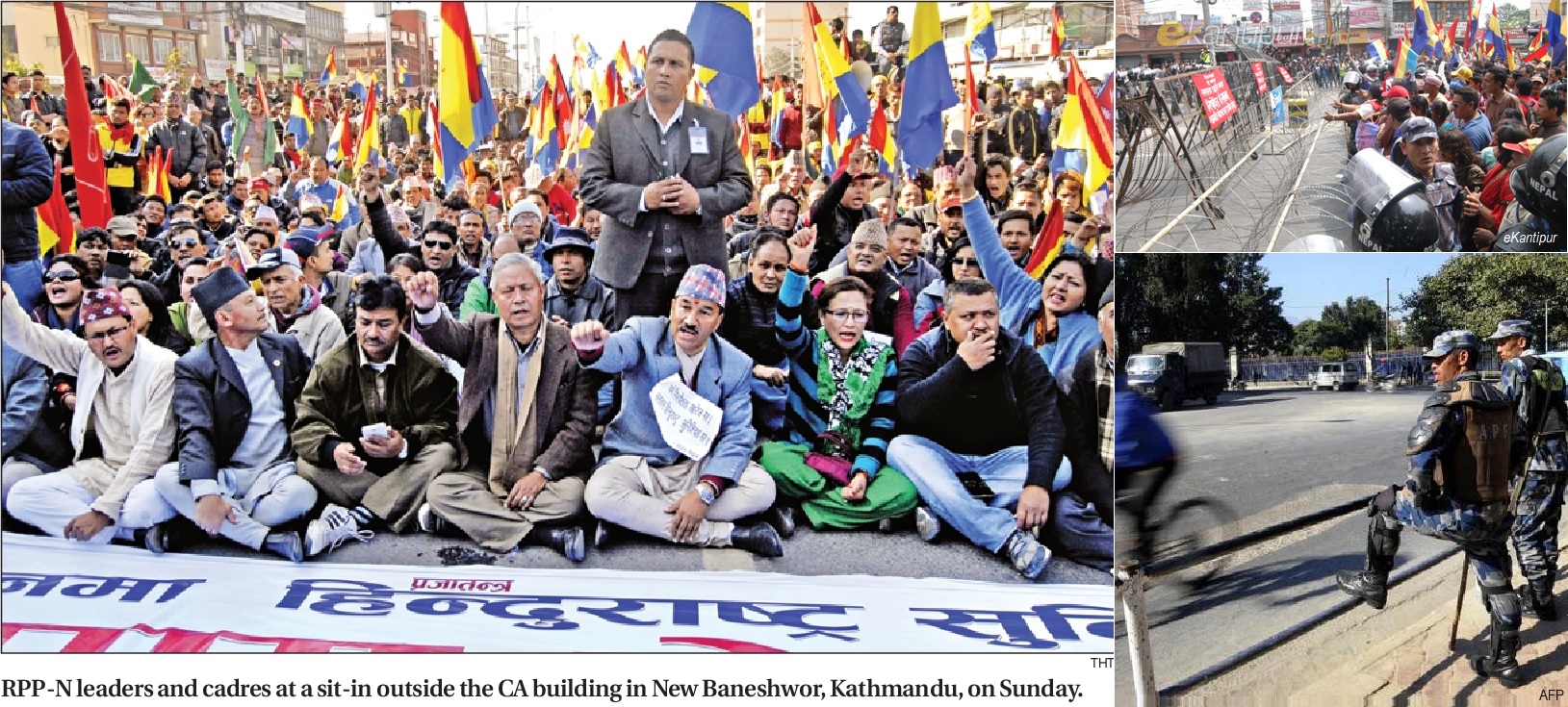 Around a dozen demonstrators received minor to moderate injury when police baton-charged them. Following the clash, they had staged a sit-in on the road for an hour and turned it into a mass meeting. Addressing the meeting, RPP-N Chairman Kamal Thapa warned that his party would capture the Constituent Assembly if the major political forces failed to deliver the constitution on January 22. “We will also organise nationwide protests and mass assemblies the day after January 22 in case the major parties fail to promulgate the constitution. We will not stop, we will break the police cordon and enter the CA building by that time,” he said.