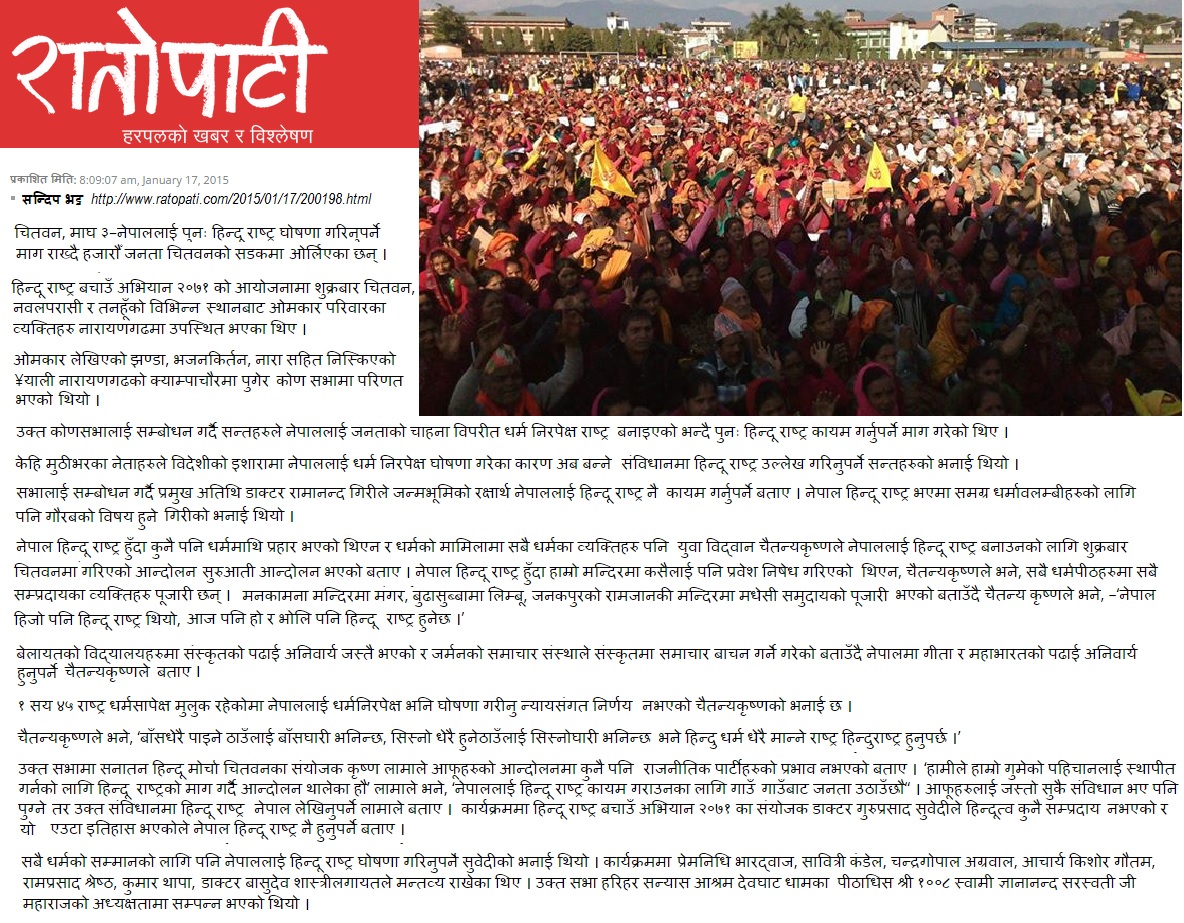 During last three months Nepal has seen unprecedented Hindu revival for the demand of Hindu Rashtra through hundreds of various demonstrations, agitations, rallies, campaigns, religious programmes etc. in its length and breadth. Millions of Hindu people of Nepal participated in these pro Hindu Rashtra programmes. While two major political parties viz. Nepali Congress and RPP-N are advocating for Hindu State in Nepal, some other forums are demanding Hindu State with the restoration of Hindu Kingdom in Nepal as earlier. Majority people in Nepal are expecting Hindu State in Nepal as Hindu Republic with giving a special status  to the Throne of Shah dynasty of Nepal along with the maintenance of the Constitution as existed in 1990 AD (i.e. 2047 BS).