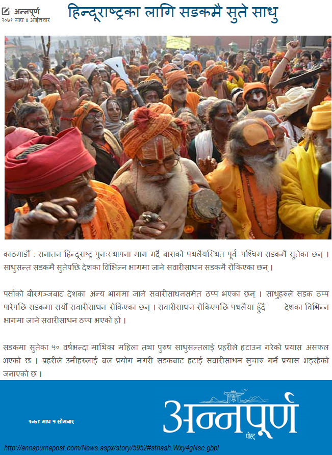 Hindu Saints took Kathmandu roads in a demand of  Nepal as Sanatan Hindu Rashtra on 19-01-2015.