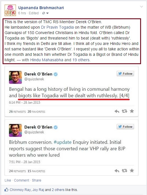 Some Hindu Organisations have taken very seriously the coinage like ‘bigots’ and ‘will be dealt with ruthlessly’ by RS MP Derek O’Brien (TMC) against Dr Praveen Togadia in twitter. If he does not beg apology within three days, some Hindu Forums in Delhi are ready to teach a lesson to ‘bigot Brien’ and he ‘will be dealt with ruthlessly’ by Delhi public. [this blockquote is not a part of this report.]