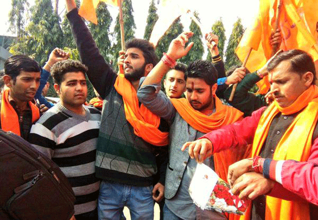 Bajrang Ddal activists burn greeting cards and shout slogan during protest against Valentine’s Day celebrations in Jammu.