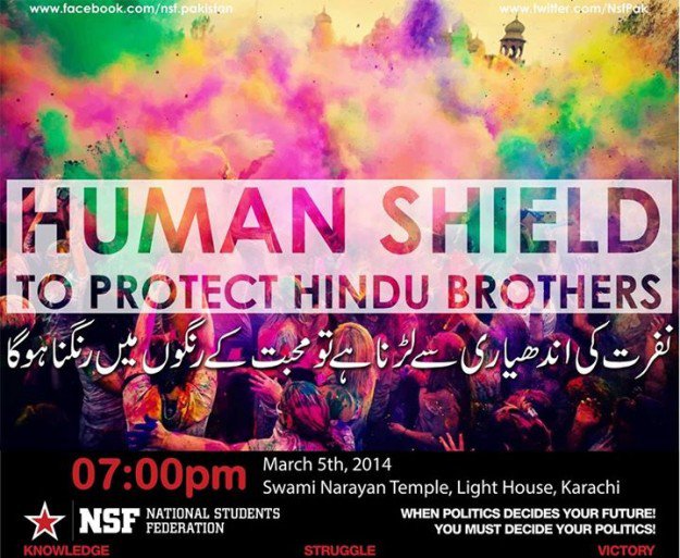 Reports convey that the student organisation, National Students Federation (NSF) assured to form a human shield outside Swami Narayan Temple, Light House, in Karachi to facilitate the Hindu people usually celebrate Holi every year at the grand temple.