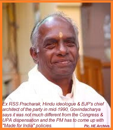 HENB | New Delhi | May 12, 2015:: Ex RSS Pracharak, Hindu ideologue & BJP’s chief architect of the party in mid-1990, Govindacharya says it is not much different from the Congress & UPA dispensation and the PM’s own arbitration on various policies not matched with the BJP’s declarations and manifesto as publicized so far.