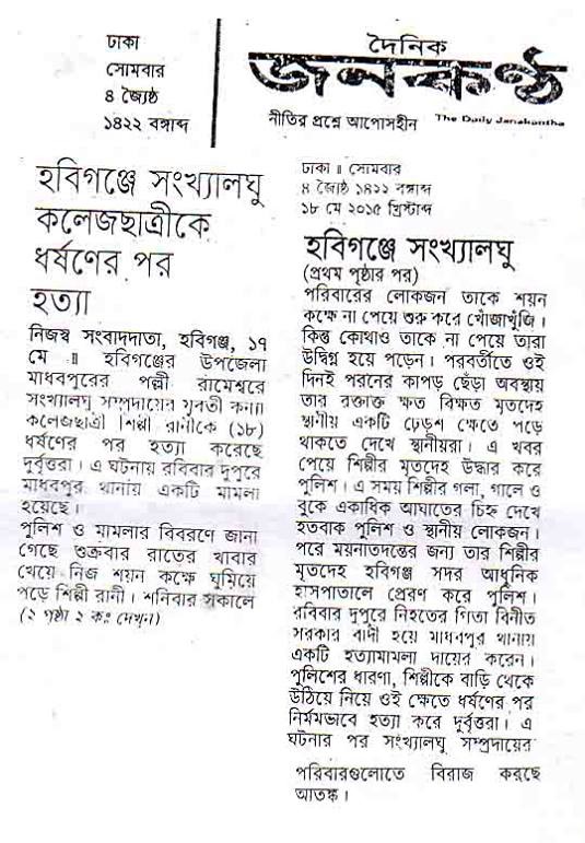 At the night 15.05.2015 (FRIDAY), Ms.Shilpi Rani (18) adolescent Hindu College girl at Rameswar within Madhabpur Upazila of Hobigonj District was killed after rape. Again, BDMW intervened into the case. S.P. Hobigonj District confirmed that one accused has been arrested in connection with the offence. The matter came to the the national Bengali daily “Janakantha” dated 18th May,2015, but the legal procedures go its own way in Bangladesh to uphold the decrees of Quran to punish the Kaffirs only. So majority Muslim people in Bangladesh just see all peace be upon Muhammad through snatching the peace from the minorities in Bangladesh.