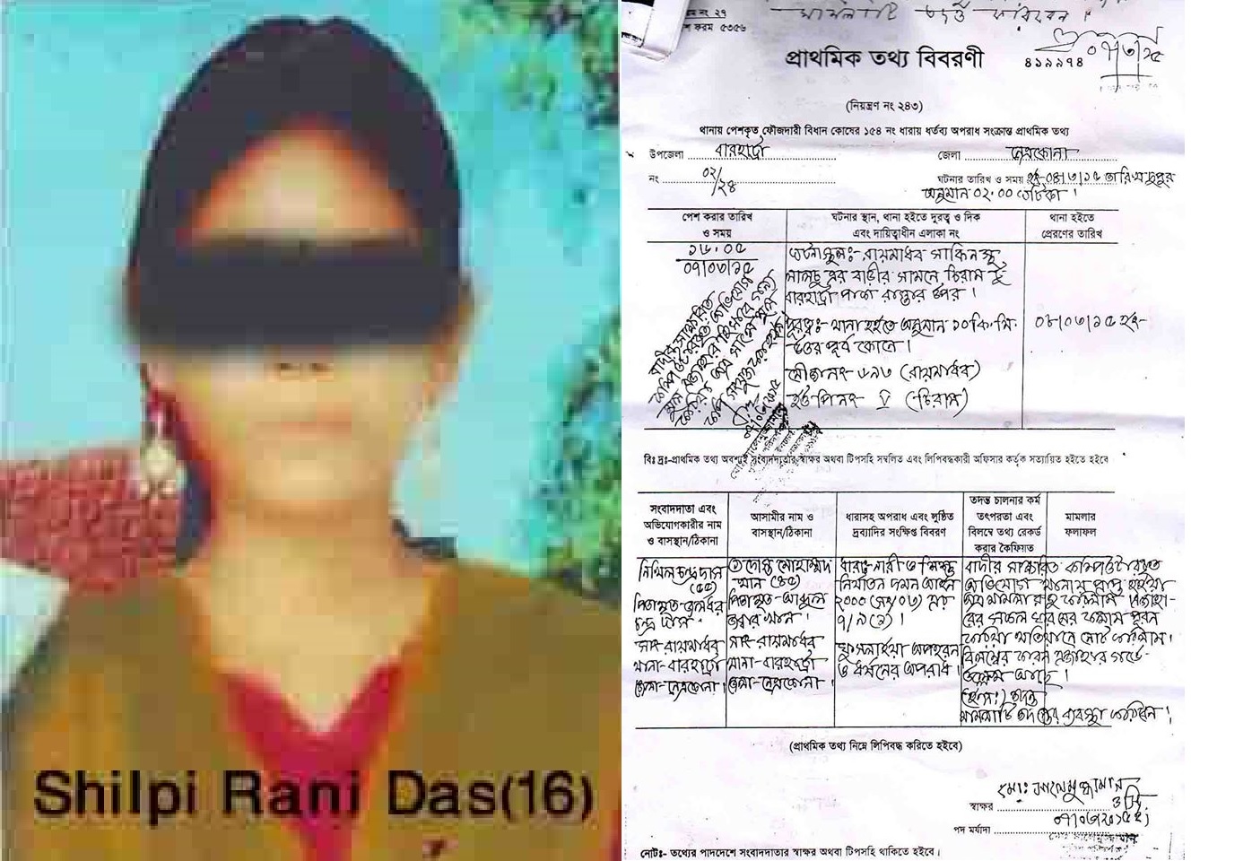 HENB | Dhaka | May 23, 2015:: More than two and half months elapsed while police failed to rescue the Minority Hindu School girl – Ms. Shilpi Rani Das (15 yr 9 m) and the kidnapper – a Muslim School Teacher – Dost Mohammad Khan was not suspended from school at Barhatta Pilot Girls High School of Netrokona District nor arrested by the Islamic Police of Bangladesh so far . It is alleged that the victim was kidnapped from the way to her home from school on 4th March,2015. Victims’s father – Shri Nikhil Chandra Das lodged First information Report at Barhatta Police station case No.02 dated 07.03.2015 under section 7/30(1) of Women and Children Repression Act,2003 against the kidnapper School Teacher, but police neglected to rescue the girl nor the Officer-in-Charge of the respective police station took any initiative to arrest the kidnapper (married person with two children). The local rights group, political activists and Women rights group submitted a Memorandum to Upazila Nirbahi Officer on 18th March,15, but the local administration failed to take necessary steps for recovery of the victim girl.