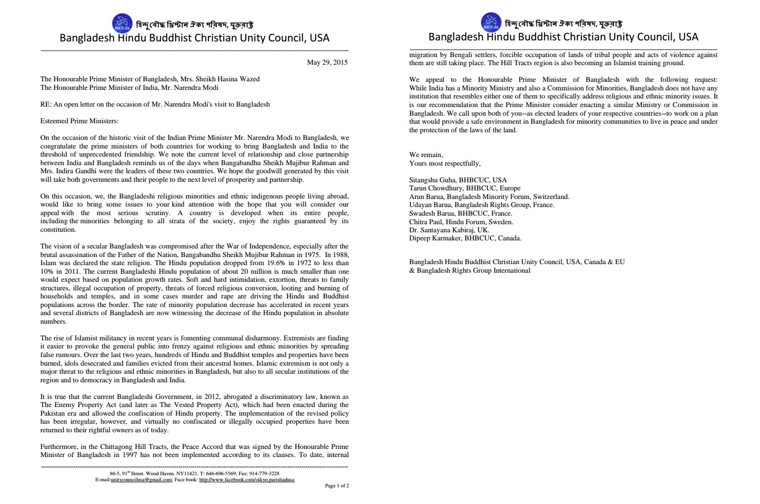 We appeal to the Honourable Prime Minister of Bangladesh with the following request: While India has a Minority Ministry and also a Commission for Minorities, Bangladesh does not have any institution that resembles either one of them to specifically address religious and ethnic minority issues. It is our recommendation that the Prime Minister consider enacting a similar Ministry or Commission in Bangladesh. We call upon both of you–as elected leaders of your respective countries–to work on a plan that would provide a safe environment in Bangladesh for minority communities to live in peace and under the protection of the laws of the land.