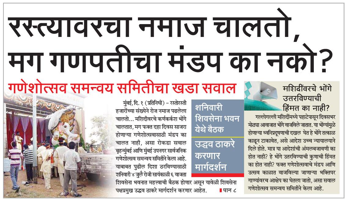 In its mouthpiece, Saamana (both in Matrathi and Hindi) , Shiva Sena asked the Govt. of Maharashtra (even being a part of it), “रस्त्यावरचा नमाज चालतो, मग गणपतीचा मंडप का नको ?“/ “सडक पर नमाज तो गणेश पंडाळ क्यों नहीं?” e.i. As there is road blocked at Namaj, why not the Ganesh Pandal (makeshift temples) on roads?