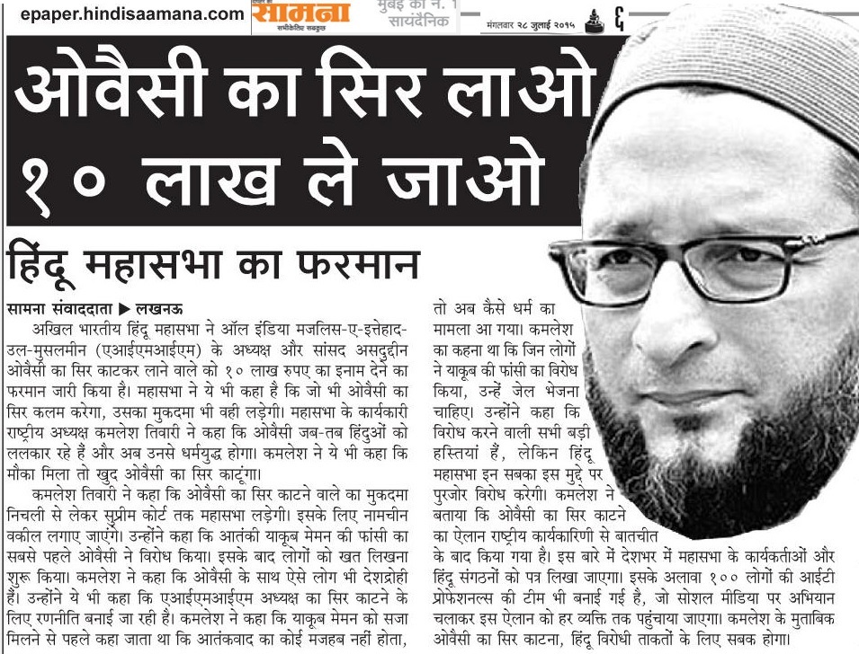 HENB | New Delhi | July 28, 2015:: As per a report published in the evening daily Saamana (Hindi Edition) of today’s edition, Uttar Pradesh unit o hindu Mahasabha has declared a Rupees 10 lakh award to slain Asaduddin Owaisi, the communal chief of Hyderabad based political party Majlish E Ittehadul Muslimeen (AIMIM).