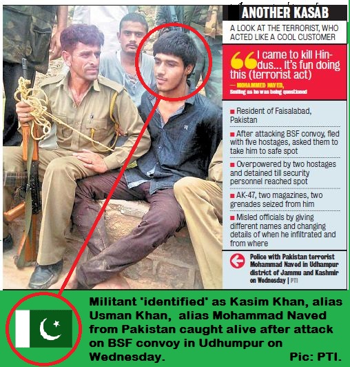 Kasim, who says he hails from Faisalabad in Pakistan, claimed before the media that he entered the Jammu region 12 days ago along with a fellow terrorist identified as Momin Khan. Khan was killed in retaliatory fire by BSF. After entry into India through a Police post, they procured thee arms and annunciation from the existing sleeper cell existed in nearby places. The terrorist group also took shelter into a Mosque at Udhampur. On interrogation the nabbed Pak terrorist hinted their plan to attack on Hindus of India and particularly on Amarnath pilgrimage.