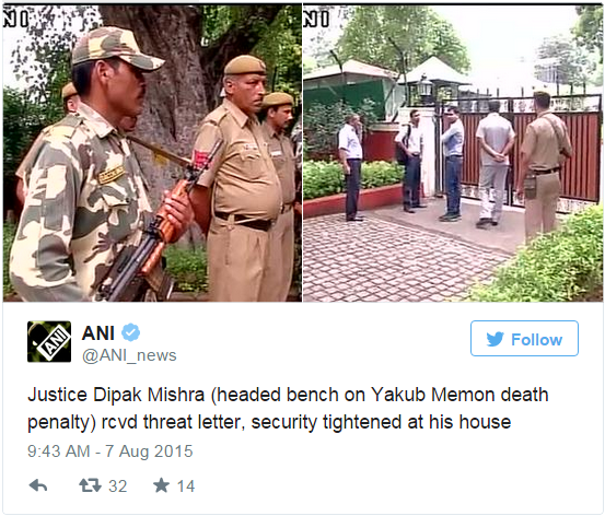 HENB | Delhi | Aug 7, 2015:: As Per Delhi Police Source, Justice Dipak Misra, who dismissed Yakub Memon’s last-minute attempt to escape the gallows and rejected his plea for a stay on death warrant, has received a threat letter at his residence.