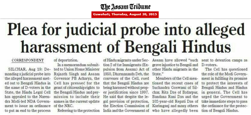 Silchar Correspondent | Assam Tribune | Aug 19, 2015:: Demanding a judicial probe into the alleged harassment meted out to Bengali Hindus in the name of D-voters in the State, the Hindu Legal Cell has appealed to the Narendra Modi-led NDA Government to issue an ordinance to put an end to the process of deportation.