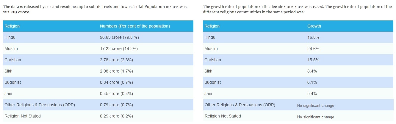 Upananda Brahmachari | HENB | New Delhi | Aug 25, 2015:: Hindu Population in India falls under 80% since Independence first time while Muslim population in India is increasing with pace. The Muslim community has registered a moderate 0.8 per cent growth to touch 17.22 crore in the 10-year period between 2001 and 2011, up from 13.8 crore, while Hindu population showed a decline by 0.7 per cent at 96.63 crore during the period, according to the latest census data on religion.
