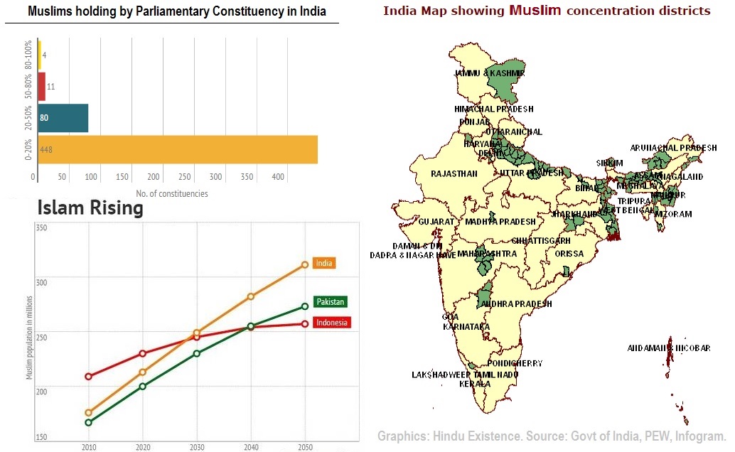 This area wise growth of Muslim population resulted 53 highly Muslim populated districts, 15 Muslim majority parliamentary constituency and there are 350 Development Blocks in India where Muslims are in majority and over 150,000 rural and 10,000 urban and metro habitations are in India to establish a Muslim might to explore the pan-Islamic strength in India. A silent population Jihad in India is invading though the secular morons deny.