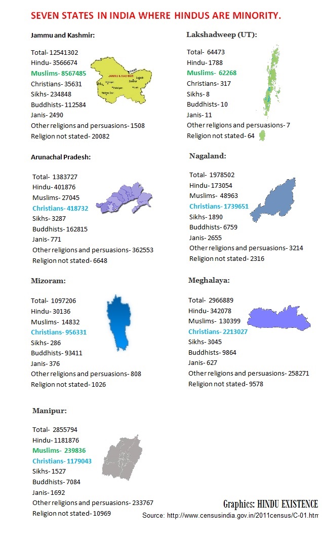 This religion based census report of 2011 reveals that Hindus have been turned minority in Six Indian States and Union Territory viz. Jammu & Kashmir, Mizoram, Nagaland, Meghalaya, Arunachal Pradesh, Manipur and Lakshadweep (UT).