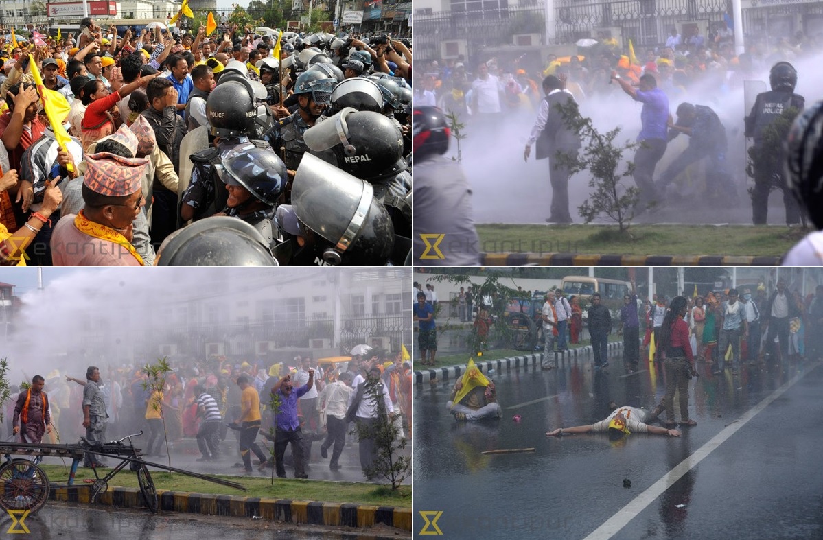 Nepal Police lobbed teargas canisters and water cannon to contain the agitating mob nearing the restricted zone, demanding restoration of Nepal as a Hindu state. A huge deployment Armed police stranded the public life for hours in the locality.