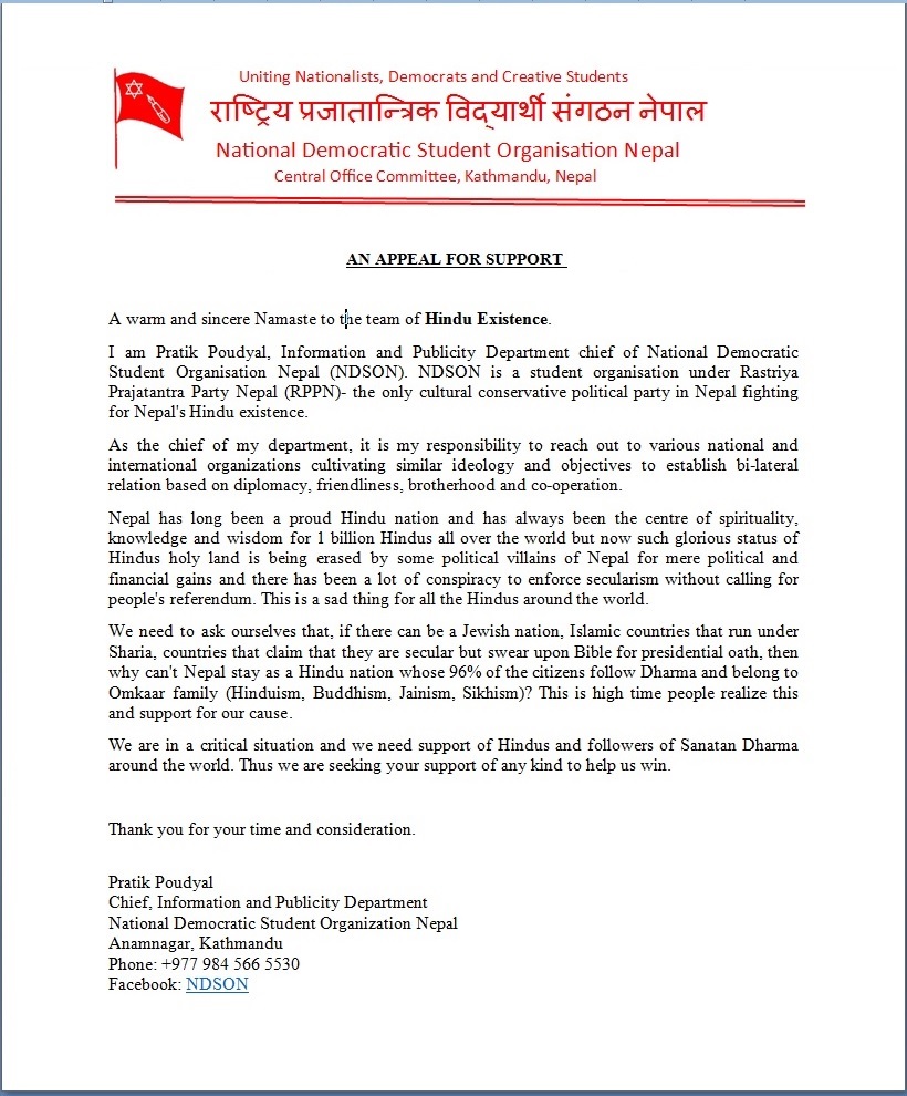Pratik Poudyal, the Chief, Information and Publicity Department of NDSON writes, “Nepal has long been a proud Hindu nation and has always been the centre of spirituality, knowledge and wisdom for 1 billion Hindus all over the world but now such glorious status of Hindus holy land is being erased by some political villains of Nepal for mere political and financial gains and there has been a lot of conspiracy to enforce secularism without calling for people’s referendum. This is a sad thing for all the Hindus around the world.”