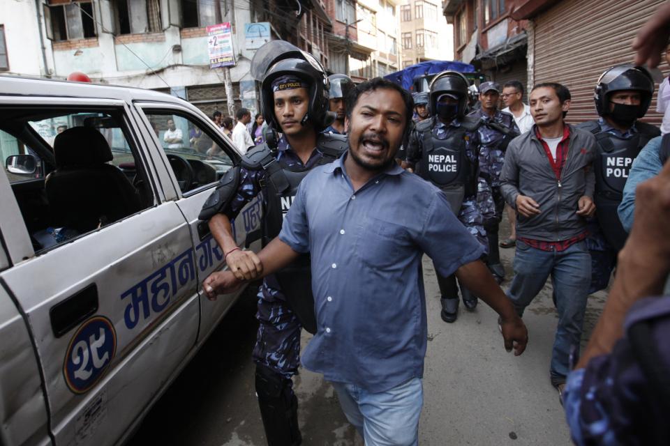 Nepalese police detain a protester during a demonstration against the government and the new constitution during in Kathmandu, Nepal, Sunday, Sep 20, 2015. Police quickly dispersed the protest and two people were detained. Police were under orders to stop any protests. Schools and offices are closed because Sunday and Monday were declared a public holiday to celebrate the constitution, Nepal's first complete political framework since monarchy was abolished in 2006. (AP Photo/Niranjan Shrestha)