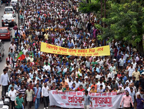 Krishak Mukti Sangram Samiti (KMSS) activists taking out a satyagraha rally towards Raj Bhawan in Guwahati from Sonaram playground on Tuesday, in protest against the Central Government’s decision to regularize the entry and stay of non-Muslim immigrants from Bangladesh and Pakistan. (Sentinel)