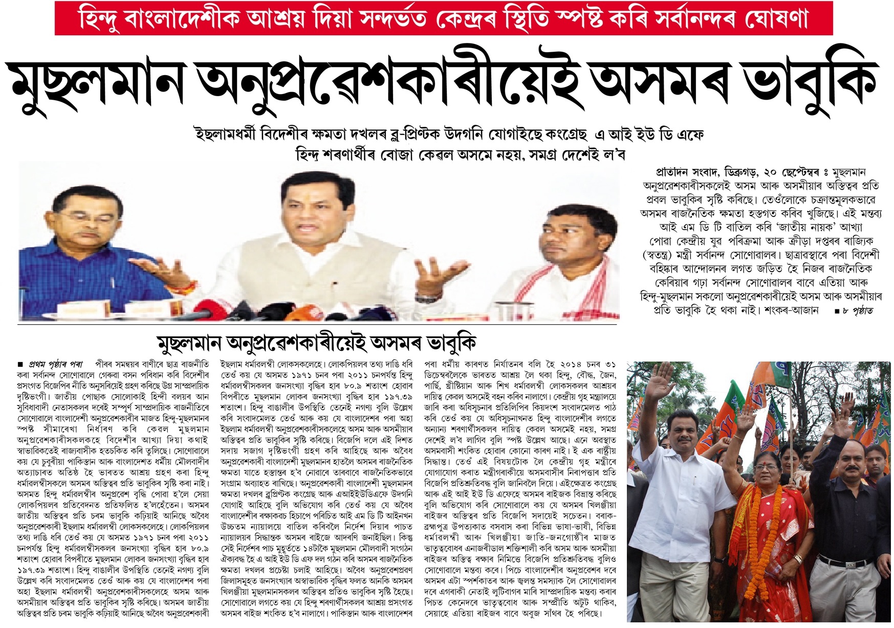 “The growth of Muslim population in the state has registered an alarming rate of 197.39 per cent as compared to the growth of Hindu population to 80.9 per cent during the period 1971 to 2011,” The Union Minister for Youth Affairs and Sports said in Dibrugarh on Sunday on 20 Sept 2015. The union minister was talking to the press after a function there.