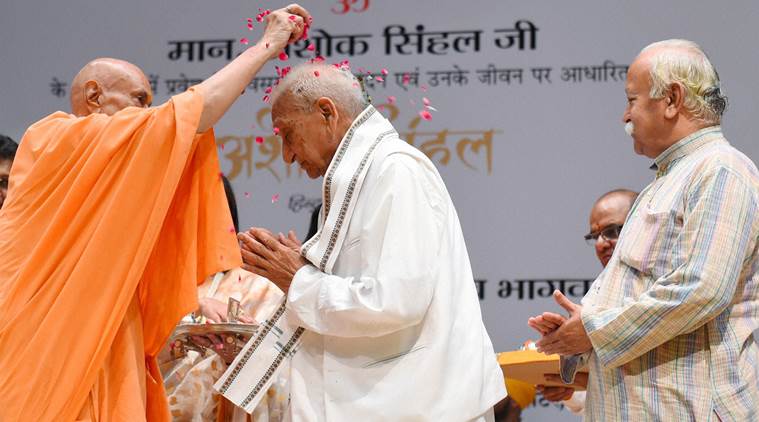 RSS chief Mohan Bhagwat and several Union ministers, including Home Minister Rajnath Singh, were present when the suggestion was made by former VHP president Vishnu Hari Dalmia at an event where a book named; “Hinduttva ke Purodha” on the life of VHP patron Singhal was released.