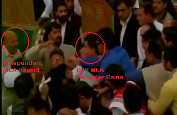 As several NC and Congress MLAs rushed to save Rashid, after BJP MLAs had roughed up Abdul Rashid at first hand, a rescued  Rashid afterwards attacked a BJP MLA as evident from the available video footage of ‘Times Now’.