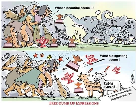 Those secularist brigade should honestly give up their financial aids, posts they do hold and other benefits they are receiving as awardee. Mere returning the awards will not do them real justice. The Inevitable law of KARMA has come to play now. Those congress affiliates, who manipulated to win the award without actual qualification are now exposing themselves. The govt. must encourage those authors and completely obliterate their names from the records.