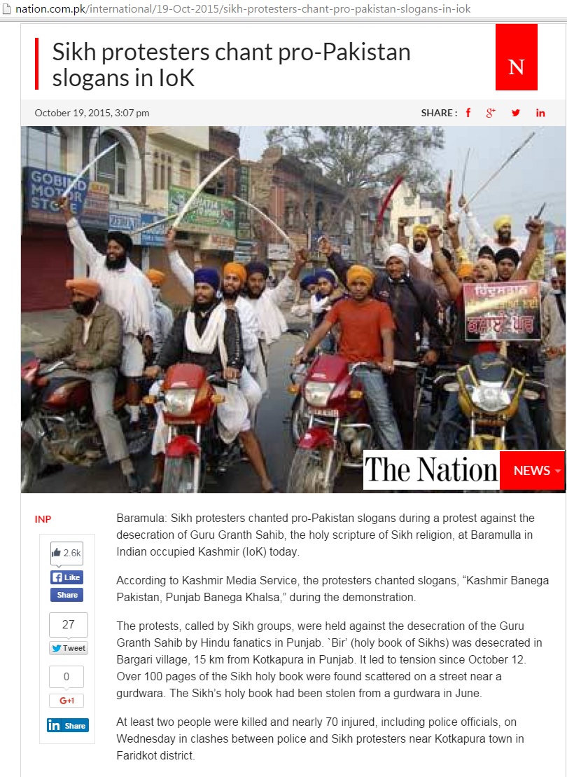 Under the heading of “Sikh protesters chant pro-Pakistan slogans in IoK“, The Nation Newspaper of Pakistan started spitting hatred upon Hindus by stating the incident as “the desecration of the Guru Granth Sahib by Hindu fanatics in Punjab“.  Without any investigation the Pak media started stamping the Hindus as criminal for Holy Guru Granth Sahib desecration. These propagators of Hindu-Sikh division and champions of Yellow journalism do not know that the Holy Guru Granth Sahib is equally respected by both hindus and Sikhs.