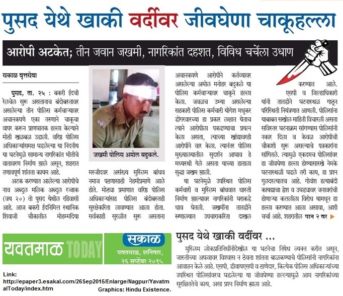 In Yavatmal, Maharashtra, a shocking incident took place on Bakri Eid Day (Sept, 25) where an on duty Hindu police constable, Amol Manohar Badukale was stabbed repeatedly by a Muslim fanatic, Abdul Malik Razzak (20 years). Fortunately the Hindu constable survived the attack. But, there is no uproar in the media about it, nor any akademik intellectual came forward to return any award.