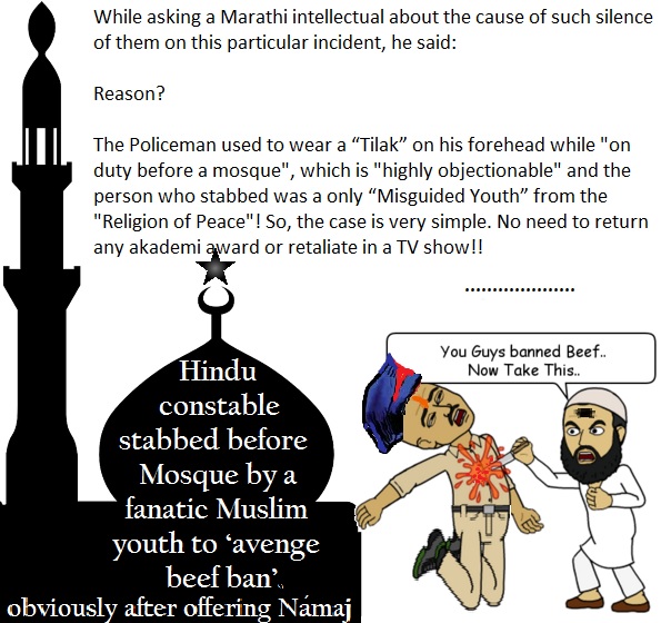 The Policeman used to wear a “Tilak” on his forehead while “on duty before a mosque”, which is “highly objectionable” and the person who stabbed was a only “Misguided Youth” from the “Religion of Peace”! So, the case is very simple. No need to return any akademi award or retaliate in a TV show!!