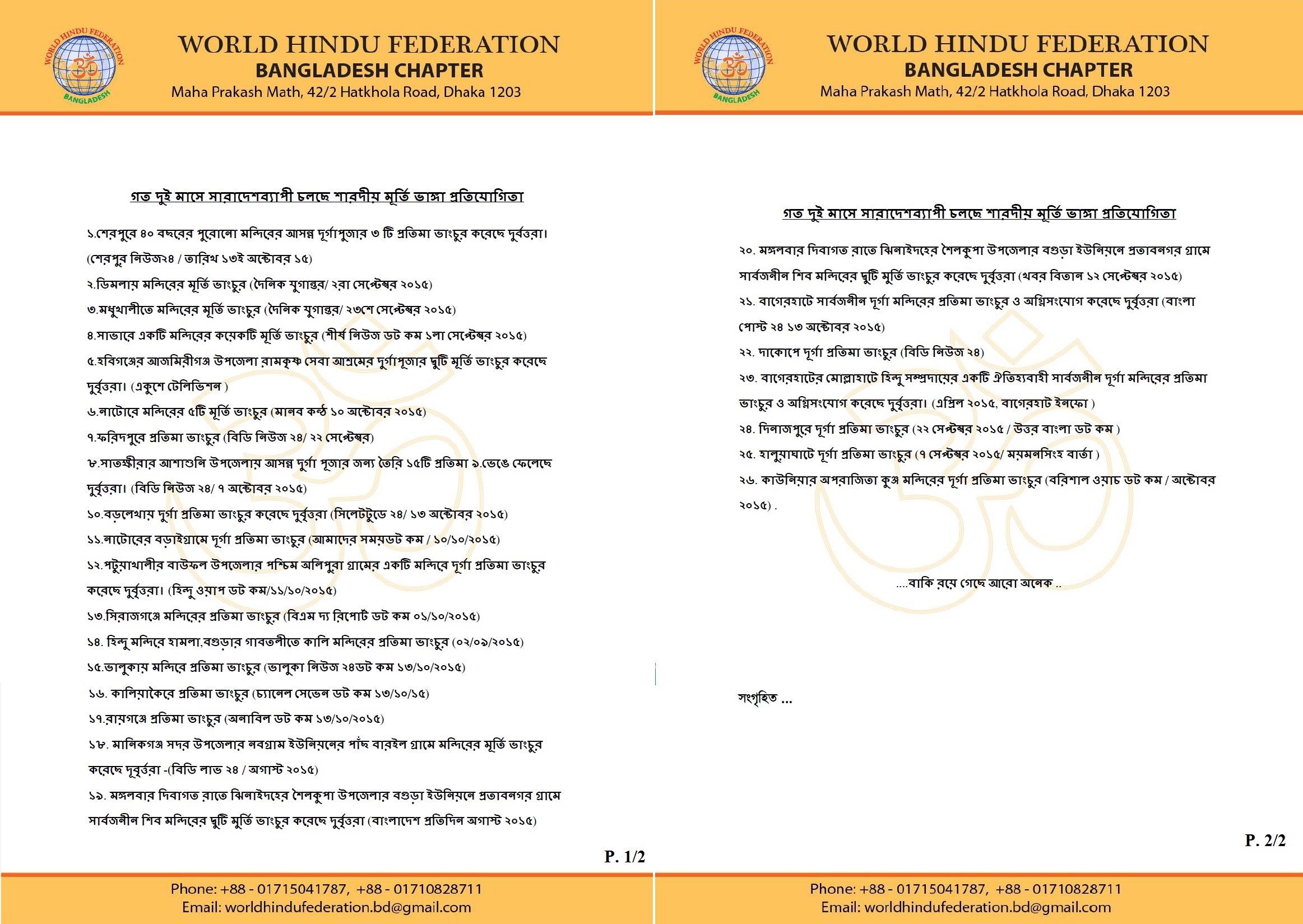 1. Rampage on Durga Idol in Haluaghat ( Maymonsingh Varta/ Sept 7, 2015)