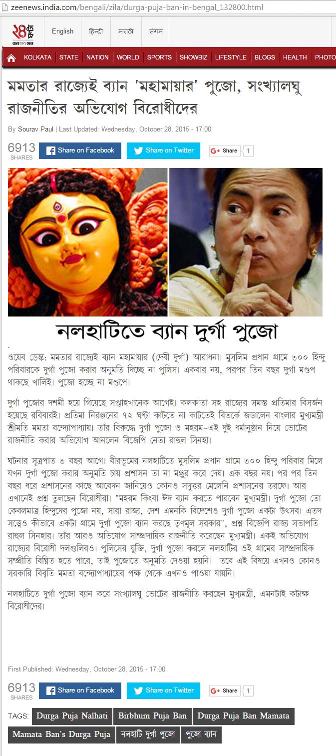 Upananda Brahmachari | HENB | Nalhati (WB) | Oct 28, 2015:: The apostle of Muslim appeasement and the main conspirator of making a Jihadi West Bengal, Mamtaz Banu Arjee (the other name of WB CM Mamata Banerjee, as critique says) is now vocal these days with ‘cara-beef’ issue in Kerala House in Delhi or the Bihar Election, but this lady of all notoriety is trying to hide her face on the revelation of a case that stopped a Durga Puja in Hindu majority Village in WB due to objection of Minority Muslim Community.