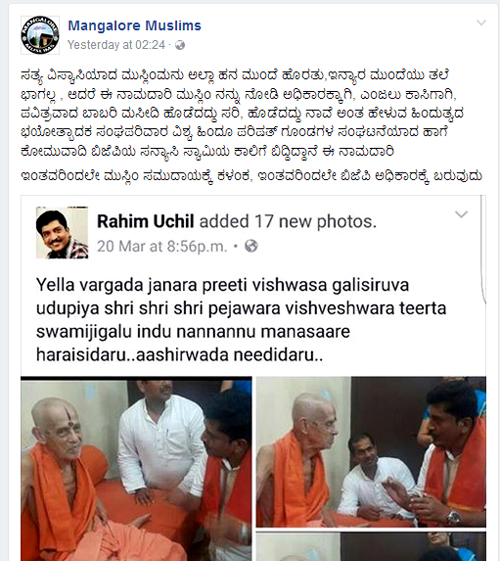 Rahim said he knew Pejawar seer for the past 25 years and had great respect for the religious leader. “I had uploaded on my Facebook Page the photos of my meeting with Pejawar seer last time wherein he presented prasadam and a shawl and blessed me. But the same has been misused and I have been accused of embracing Hinduism for the sake of power and money,” said Rahim.