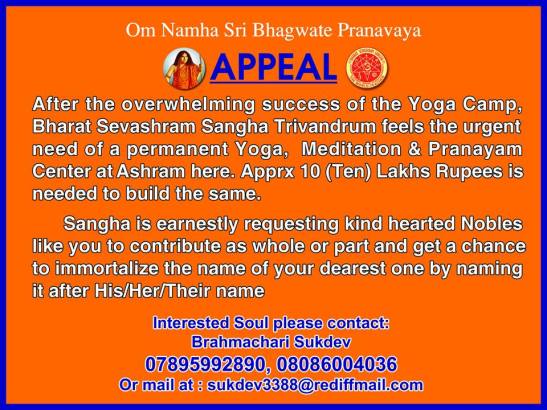 Brahmachari Sukdev, branch in charge, told HENB that they are trying to set up a permanent yoga centre which will be open to all free of cost. In an appeal, Brahmachari requested the noble souls to contribute for the purpose. The Thiruvanathapuram (Trivandrum) branch of BSS conducted a weel long yoga Camp in previous year also.