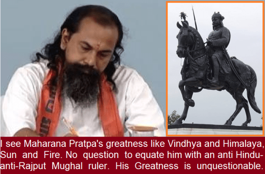 “Maharana Pratap was Great undoubtedly. It is unquestionable. So, I can’t go with Rajnath Singhji’s version – Why isn’t Maharana Pratap called ‘the Great’ like Akbar? I see Maharana Pratpa’s greatness like Vindhya and Himalaya, Sun and Fire. No question to equate it with an anti Hindu- anti-Rajput Mughal ruler. As the patriots of this land we must glorify and follow the path of Maharana Pratap and we have to expose the conspiracy of all Mughal and Muslim persecutors and rulers in our history”, Brahmachari added.
