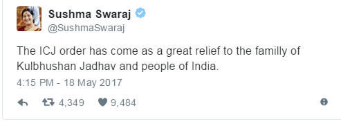 Union minister of external affairs Sushma Swaraj who had earlier said that India will go out of its way to ensure Jadhav’s return took to Twitter hailing the top court’s decision.