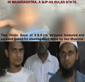 Upendra Bharti | HENB | Mumbai | May 22, 2017:: Two minor Hindu boys at Ulhasnagar in outer Mumbai were stripped naked, tonsured, garlanded with slippers and paraded in public Saturday allegedly by a Muslim shopkeeper and his sons and relatives, after the boys took snacks from his shop without permission, as alleged. The police have arrested the shopkeeper and his sons. The two victim minor boys belong to poor Dalit Hindu families, as reported.
