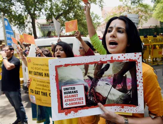 Animal Rights activists holding a peaceful march from Telangana Bhavan to Kerala Bhavan to protest against atrocities on animals in New Delhi on Friday. | PTI