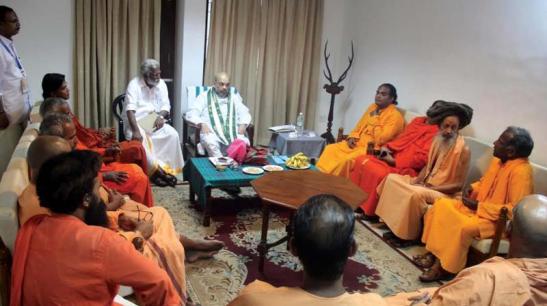 B Upendran | HENB | Thiruvanathapuram | June 5, 2017:: Following his meeting with Church leaders+ on Saturday as part of his three-day state visit, BJP national president Amit Shah held talks with Hindu Monks, Saints, Seers and Muth Representatives at Thycaud Government Guest House here on Sunday. After the meeting, Santhigiri Mutt organising secretary Gururatnam Gnanatapaswi and Brahmachari Bhargavaram told reporters that their visit was a courtesy call. The meeting discussed prevalent issues, including Hindu murder, persecution and Hindu vilification being faced by the Hindu society in general. Amit Shah informed the sanyasis that their grievances would be considered favourably.