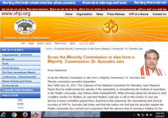 “The Chairman of the National Commission for Minorities, Syed Ghayorul Hasan Rizvi by implementing the agenda of the separatists, is strengthening the feelings of separatism in the Muslim community, says Vishwa Hindu Parishad (VHP). While informing about the decision to start a helpline number for Muslims, he said that Muslims could give a call on this number in case any atrocity is being committed against them. Reacting to this statement, the international joint General secretary of VHP Dr. Surendra Jain today said that this makes one feel that the atrocities against the Muslim community has reached such proportions that the extreme step of opening a helpline for the Muslims had to be taken up.