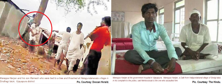 Hariram Harijan | HENB | Sindhagi (Karnataka) | June 29, 2017:: A Dalit father and his 22-year-old son of Hindu Faith were tied to a tree and brutally beaten up on Sunday by a group of Muslims in Karnataka’s Vijayapura after his other son eloped with a woman from the Muslim family. 50-year-old Mareppa Harijan and his son Ramesh were subjected to the assault in Halagundakanal village in the district of Vijaypura of Karnataka.